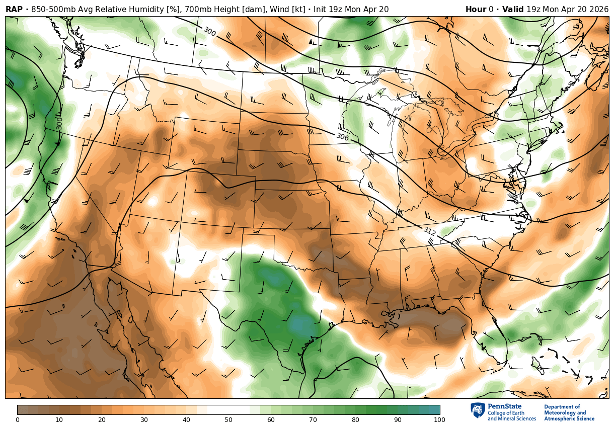 Short range forecast from the RAP model, plus MRMS radar and surface observations.